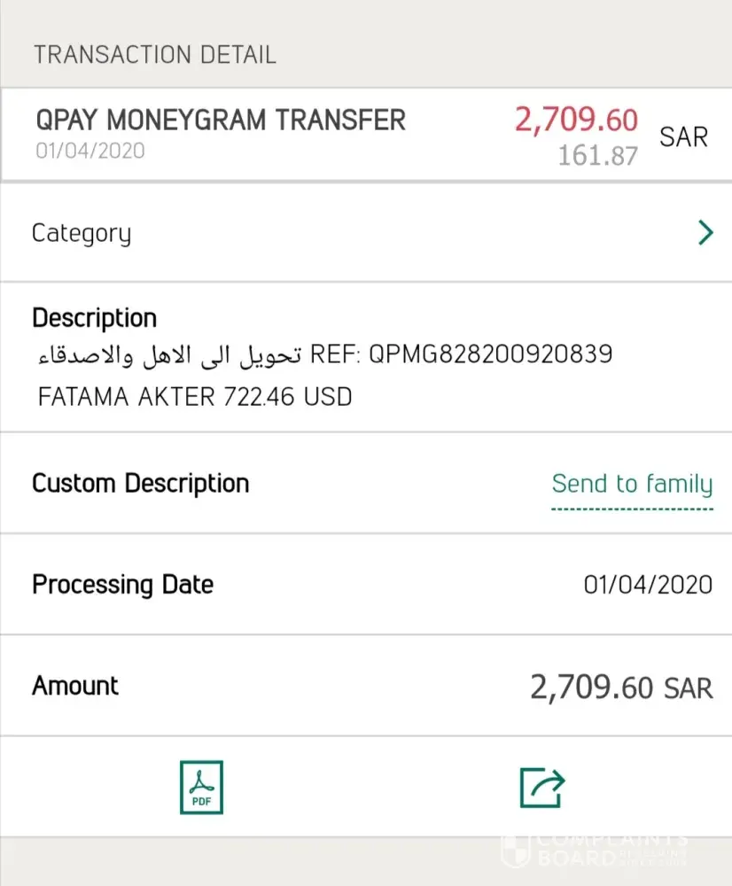 With due respect, Last 6 days before I have transferred amount to MoneyGram in Bangladesh from NCB account regarding this Ref No. QPMG828200920839 but not yet received until now, kindly send me MG Ref. Number because when my family person go to moneyGram they demand 8digits reference code but I have this Ref No. QPMG828200920839 but moneyGram office is not paying, hereby is attached sending money picture on 1st april 2020, last month I have sent money through atm also thats picture is attached, in this picture 2 references numbers are mentioned but we can get money to using MG Ref. No; thats are 8digits, I don't have 8 digits number. kindly send me MG REF. 8 digits number for gettting money from MoneyGram or refund money.