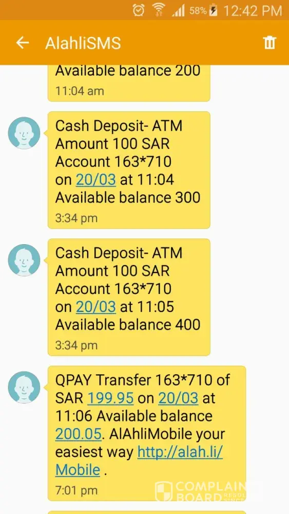 I have already sent a mail narrating above facts through the mail id [protected]@alahli.com. However I have not received the credit to my destination account or re credited the amount in my account or received any reply from the Bank.