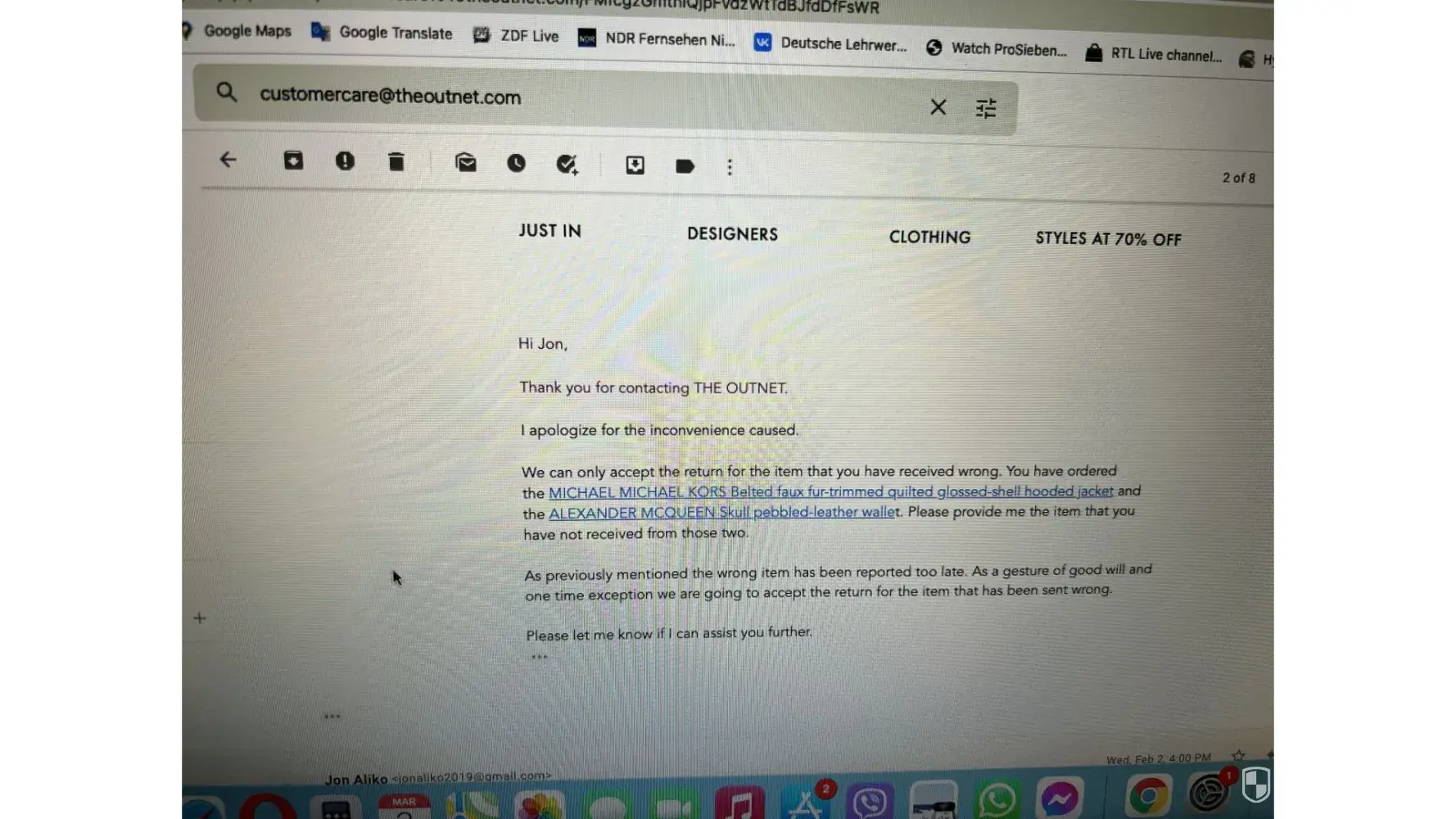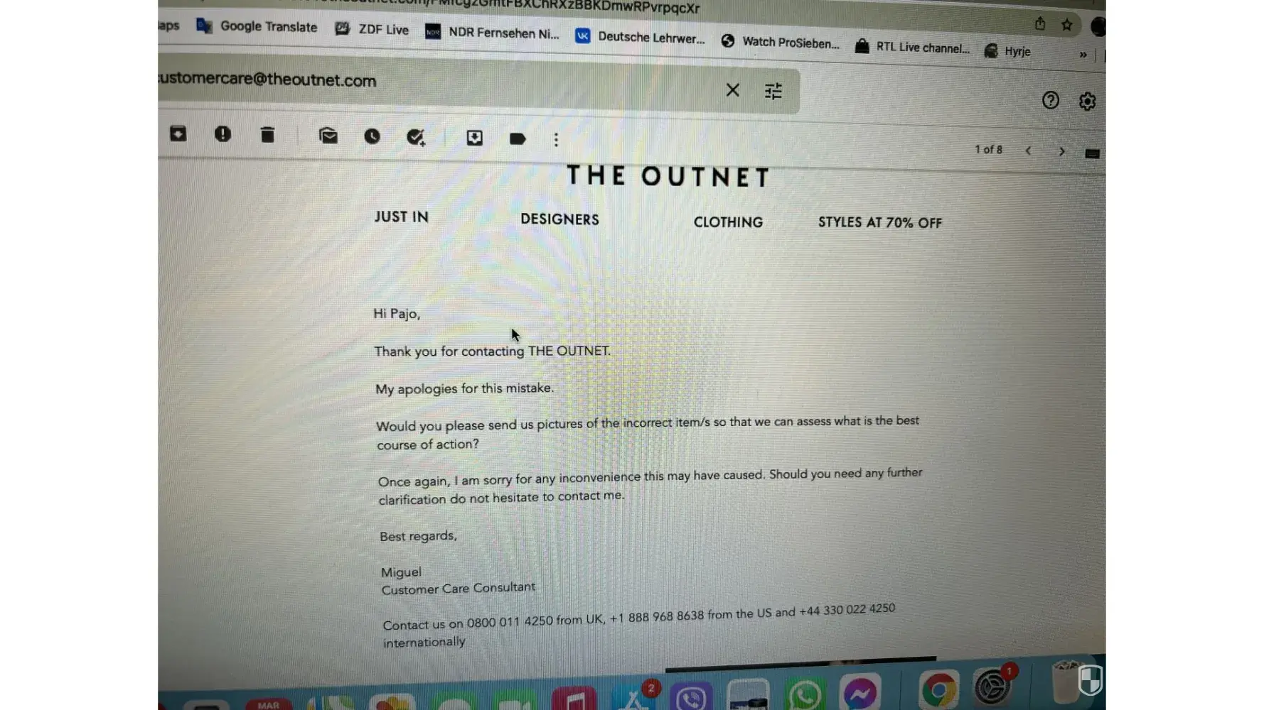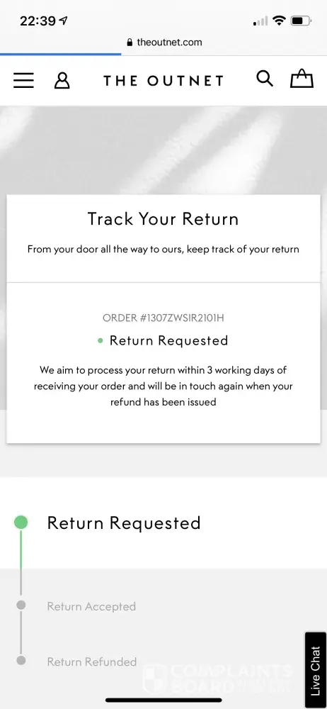 Below i have attached emails with theoutnet, but the chats and the phone call i have no photos.