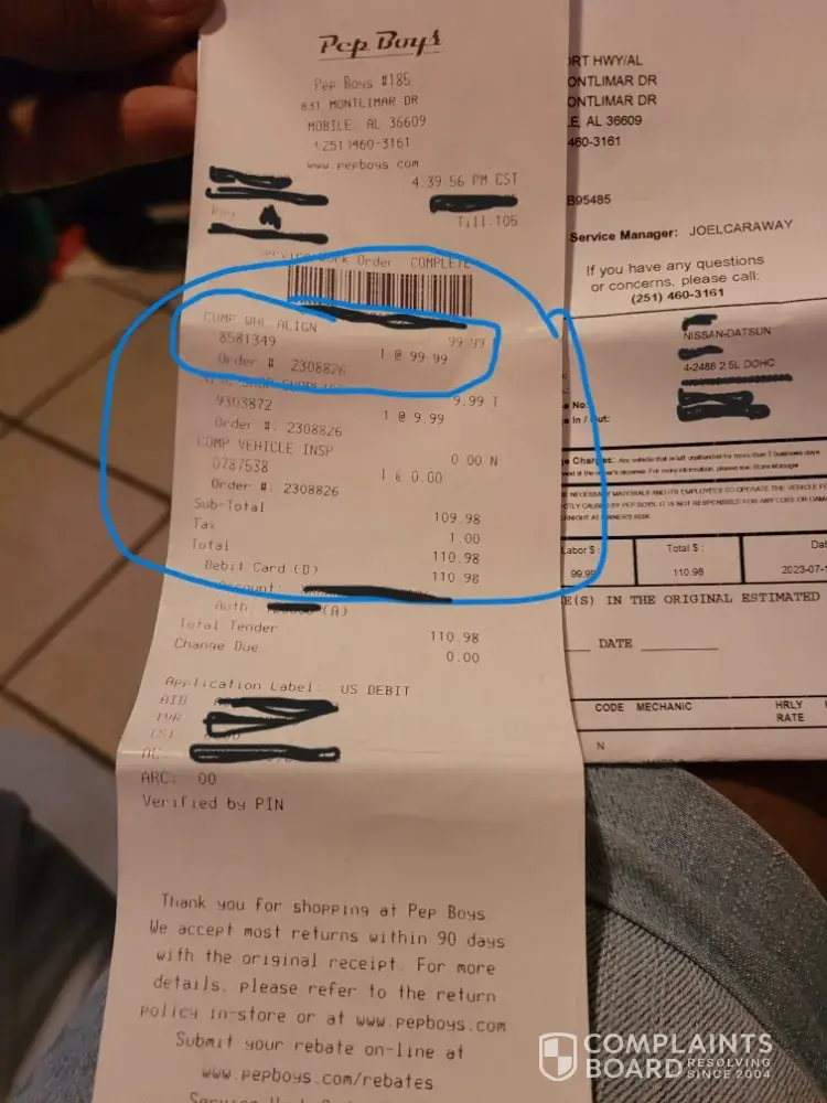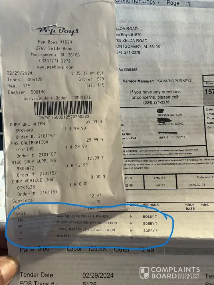 You failed to fully disclose the prices on your website for $99 front alignment services, in which I was charged extra 29.99 for services/parts I never authorized and never given the option to refuse the charge. My car was returned to me not aligned which later almost caused me to collide with an 18-wheeler, and even though I was given the option to get my car towed to another location, that location will not call me to update the service on my car. My car got to them on Friday 2/29/24 and they called me Saturday at 6:39pm to explain that my car would not be ready until Tuesday, as the mechanic was going out of town. That left me with no transportation and no way to get around and they never even cared if I had a job I had to go to or anywhere else to be. There was no accommodations made for me and the next PB attempted to extort money from me by saying I needed new control arms when I just had them replaced less than a month ago. A friend had recommended Pep boys to me because I was looking for a low-cost solution after just putting money in my front end repair. I replaced four tires, front brakes, control arms and control axles and tire rods, and they tried to scam me into replacing the control arms by telling me I needed new ones.