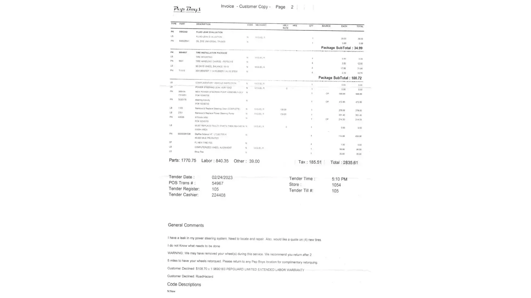 I have had a power steering fluid leak for a while but I just continued to add more power steering fluid. On my vacation to Florida from January-March 2023, it got worse as i headed down to Florida and I was adding power steering fluid approximately every 300+ miles. I took it in on 2/22/23 for investigation. The Clermont Pep Boys Auto #1054 store diagnosed it and recommended to replace the power steering pump assembly and the complete steering gear box (Ticket #[protected]). The mileage was at 234,557. I authorized the repairs to occur. They called me the next day and I picked it back up on 2/23/23 and paid the bill.