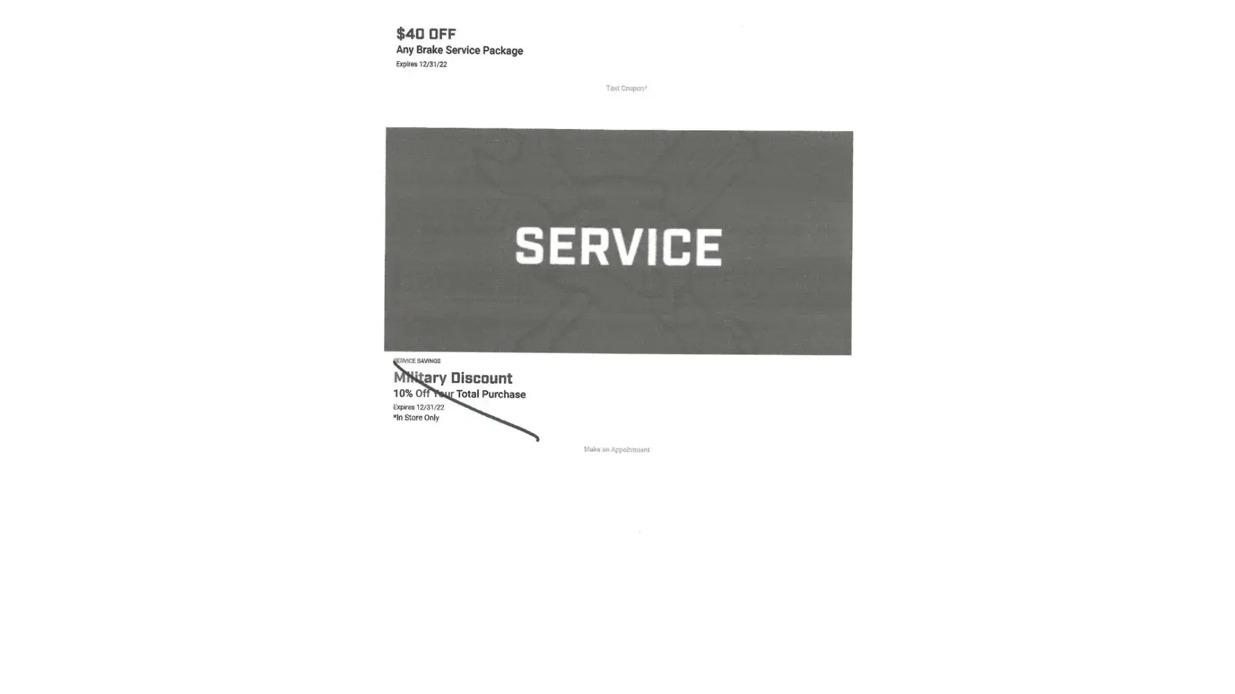 I went on my Pep Boys login page to schedule all new tires for my vehicle and saw where they were giving a 10% off the total bill to seniors until 12/31/22. I made the appointment and went into store #1809, transaction #2029651, and had new tires put on. The tires I had installed also had a buy 4 tires and receive a $100 off your purchase. I picked up my car and went home and the next day I noticed that there was "No" Sr discount per the coupon I had. When the store was questioned about it, I was told that because I got $100 off a $1300 purchase that they could not do a Sr discount! I'm sorry but the fact that I'm a Sr has nothing to do with promotional merchandise/service discounts. If you claim to give Sr's a Discount and Military Discount per a coupon, then this should be honored regardless. I have attached a copy of the Sr Discount from my Pep Boys login page.
