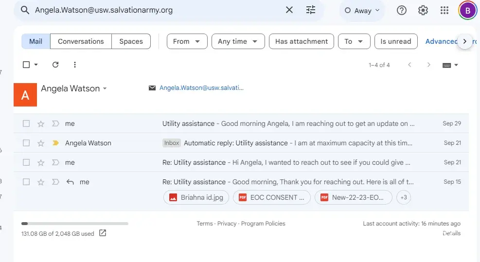I reached out to salivation Army at [protected] servicing zip code 80241 for utility assistance. I did the complete intake process, I was told by customer service that someone would reach out to me in two weeks. This was around August 1st 2023. I did not hear back from anyone so I called customer service back. They said they didn't have my info and I needed to re-do the intake process. This time they gave me the name of Angela Watson and the number to reach her. I called and left her a message and gave her all of my contact info. After another two weeks on 9/15/2023 she sent me an email requesting that I send her the Application, bill and ID to her. I sent all required documents back to her. Now its Oct 16 2023 and I still haven't heard anything from anyone. There is no one other than Angela to contact at this location.