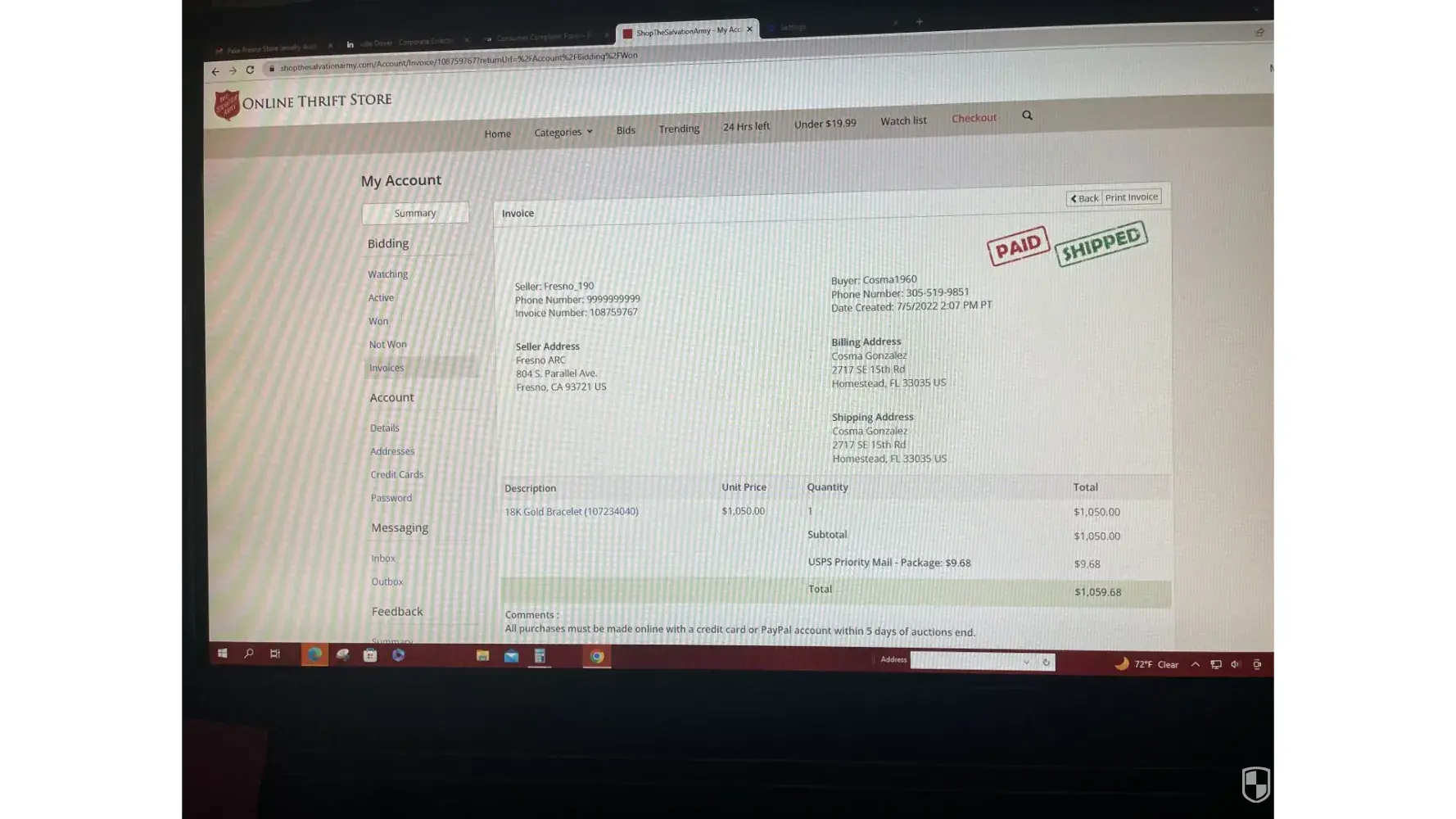 I bought an 18K gold bracelet in a Salvation Army auction that ended up being fake, and they refused to take it back because I found out when the bracelet started discoloring and a few months had gone by. They refused to honor the refund because the time for returning the item had expired. But I see this as a fraudulent transaction, and the refund should be honored.