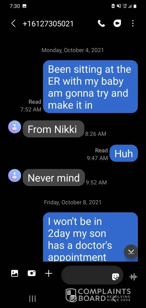 I was told I missed 4 days and was late 4 days every day I was late and didn't come into work I text PATRICK and he said okay