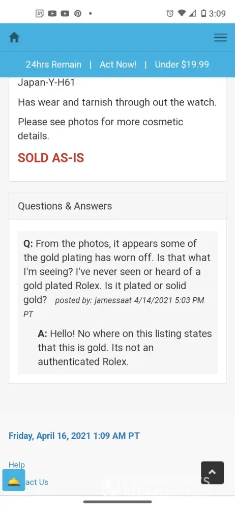 During a recent online auction, there was a Rolex listed. Oftentimes, the person who physically sees it can see things that you cannot. After viewing the photos, I posted a question asking if what I was seeing was gold plating worn off. The response I received was very rude from a Salvation Army employee who just got over $300 for a $20 watch (see attached photos). I have purchased several items from the Salvation Army (in store and online), but this definitely makes me think twice about making another purchase from the online auction. You kind of rely on the employees posting to represent the product to the best of their knowledge.