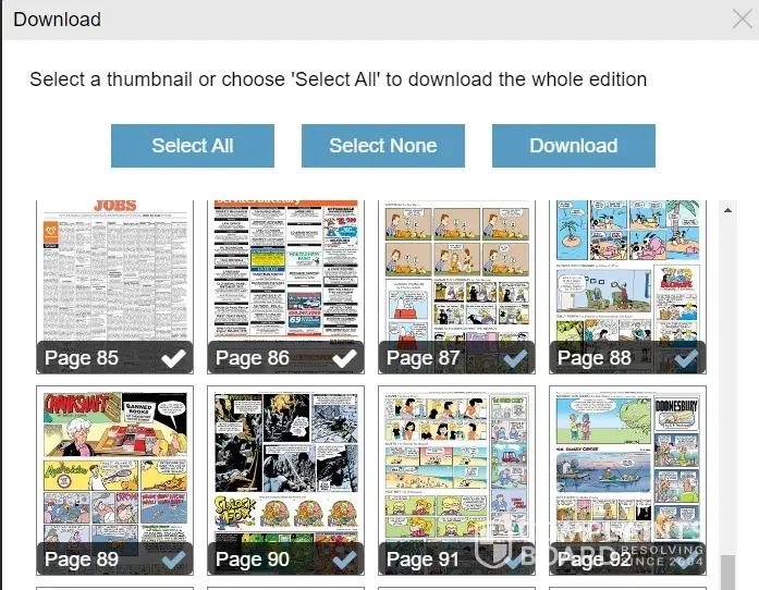 As before, your online Sunday edition (this problem exists in the daily editions also) has a problem with the comic section downloads. When checking the thumbnails to select pages for download the program does not download the selected pages. For example (see file trib5.jpg) when checking today’s thumbnails (in this case pages 88-92) 6 pages and selecting "download" the program downloads 55 pages not 6. If we select pages 87-88 (2 pages) the download is OK. If we select pages 89-92 (4 pages) the download is OK. Otherwise, we get many more pages than selected. It appears that if the thumbnails are not contiguous (or on the same line) the instructions do not work. Looks like a programming bug on your end. We hope you will fix this problem going forward. Please advise!