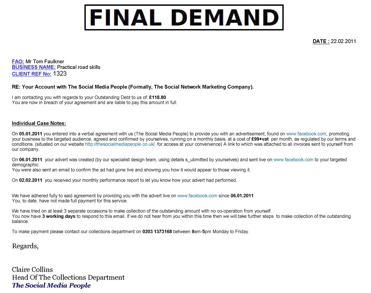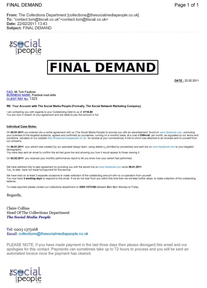 Now, here is proof that The Social Media People ‘got it wrong’ – in several ways - in a Final Demand for payment.