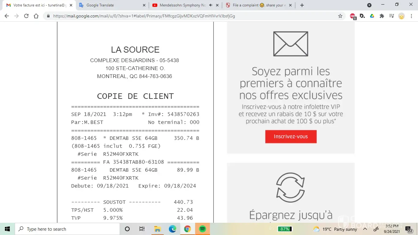 I went to the Source in Eaton Centre to see what they could do for me. The guy at the counter first refused to reimburse me because I bought the product at Complex Desjardin but consulted a few other members there and finally decided to reimburse me. I needed a tablet for my trip, so I ended up buying Samsung Galaxy Tab S7FF. Fortunately, this one is working.