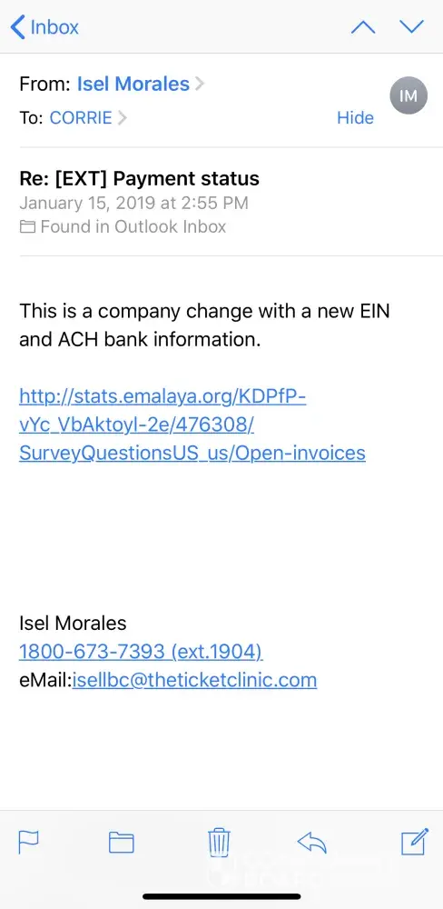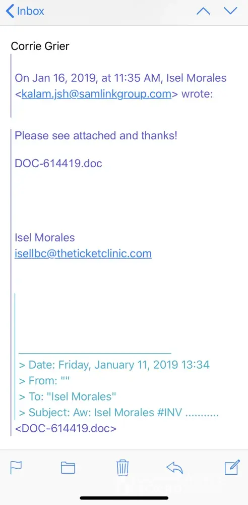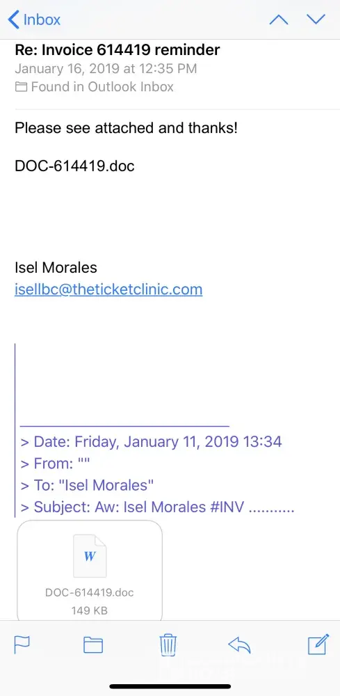 I started receiving these emails months back from an Isel Morales who supposedly works for the ticket clinic. The emails include a link which if clicked on will install spyware on the device. The email that is being used is isellbc@theticketclinic.com. It also includes spam phone numbers which will direct you to give them money on an "unpaid invoice".
