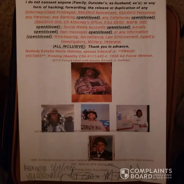 I do not consent to (any family; ex-husband; no exe's; outsider's; ssa/afge employees) without "my" prior consent; impersonation; retaliation; reprisal; hacking; duplication; or the release of any attorney-client privileged; ssa/oho personnel or retirement annuity; personal & banking; investigators; law enforcement; military; veteran's; social media; wiretapping or surveillance open/closed accounts information (all inclusive). Thank you in advance, mellody estella maria williams-huntley, proving identity.