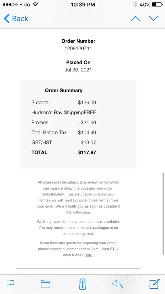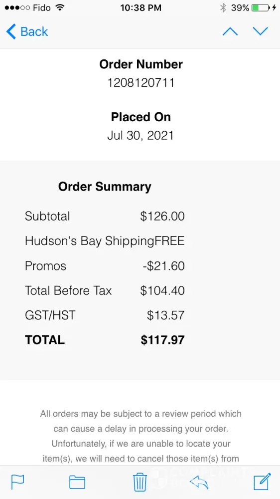 I placed an order on the Hudson's Bay website Canada. My order number is #[protected].