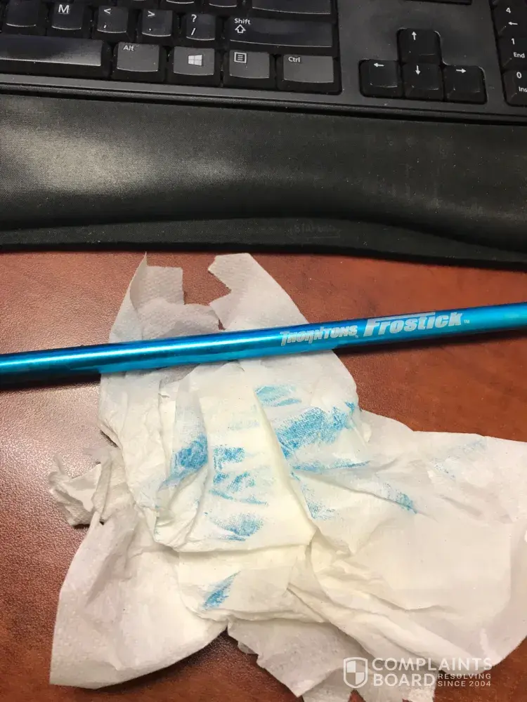 I purchased a few "Frosticks" from a Thorton's gas station in Plainfield, IN a few months back and have been using them for a while now. Well today while at work, I washed out my cup and frostick. Much to my surprise, the teal color of the stick came off on the paper towel that used to dry it. I haven't noticed this previously because I've always washed them at home and I have dark dish clothes. This is shocking not only for the fact that the color is coming off but simply at the idea that this coloring could have also be ingested when using it in my drinks. So much for thinking that I'm helping the environment by not using disposal plastic straws.