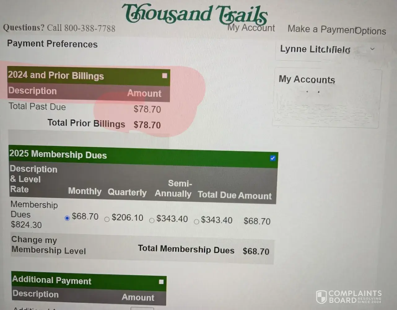 Sept 2024, I paid the remaining balance of 2024 dues. TT apparently continued to charge $5 monthly billing "convenience fee". When the $5 "for 2024" charge reappeared in March 2025 (I had paid both Jan and Feb 2025 dues + $5 conv fee) I paid it only to have it charged again in April. I paid the 2024 charge again, tried to call many times but no answer during their posted hours. A few weeks ago, I finally reached a TT rep who tried to credit the $5 for 2024 payment and remove it from future billings. In May and June, the $5 for 2024 is still there even though I have the print-out of my having checked the box to pay $5 for 2024.