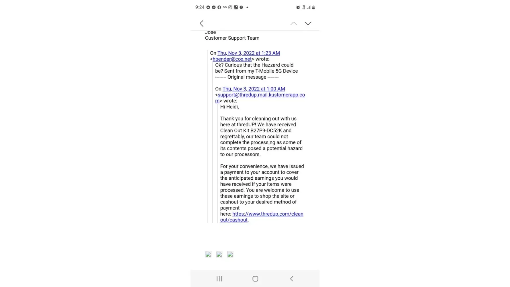 The links for Thredup customer service and chat links are inaccessible.