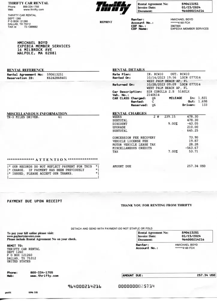 Thrifty car rental invoice 1/23/2024 — incorrect billing ra 590613251