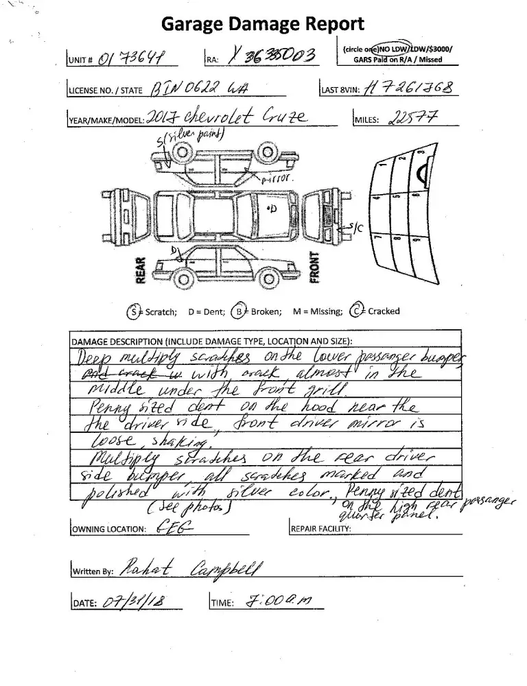 1. As you can see by the original rental agreement, I didn't initial the two damages they marked on the driver's side door area and the area below the passenger side headlights. This was due to me not agreeing to what they marked down from their inspection.