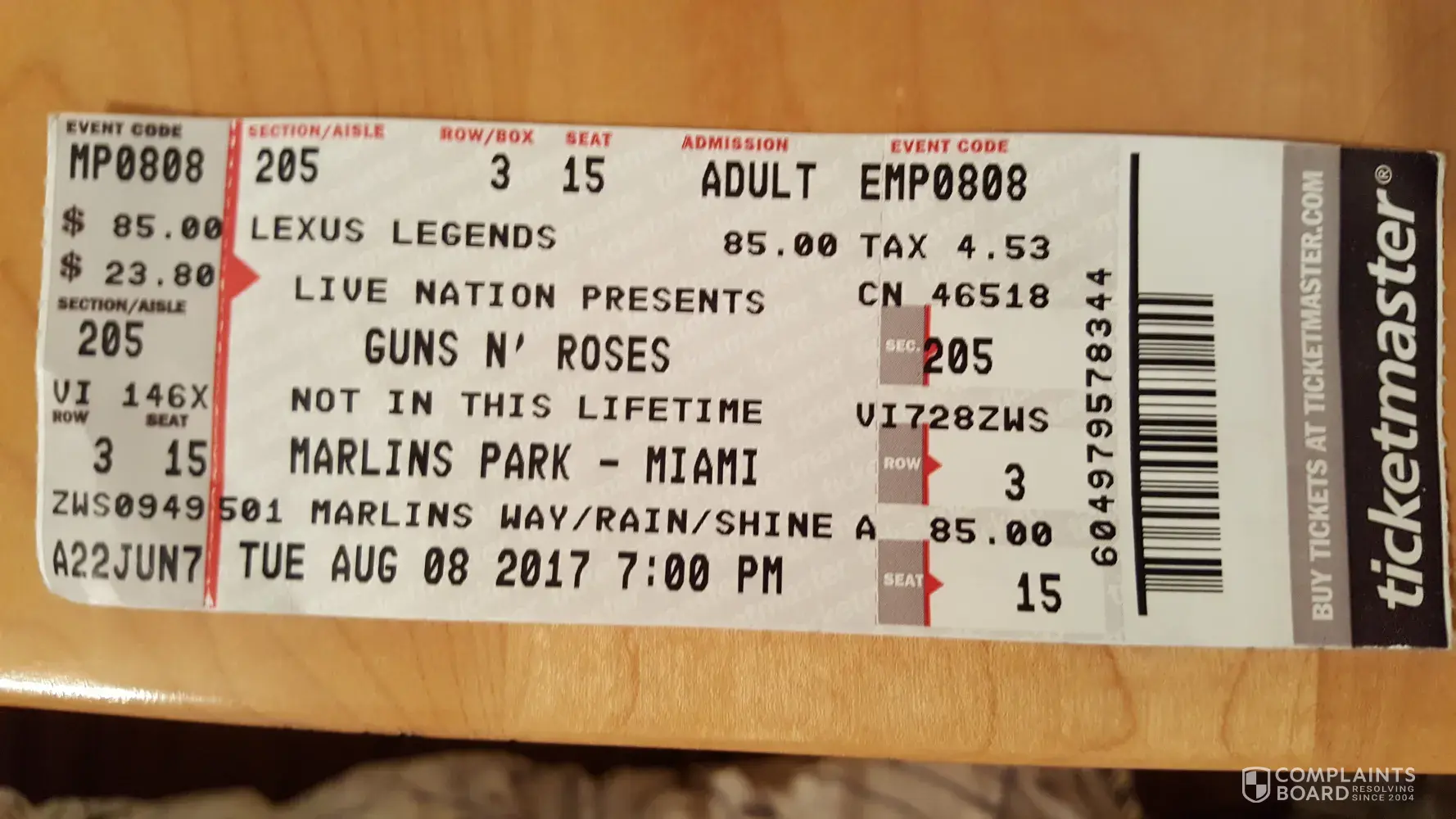 I bought two tickets for me and my girlfriend well in advance for the Guns n Roses show in Miami on August 8th. Sector 205, Box 3, chairs 14 and 15.