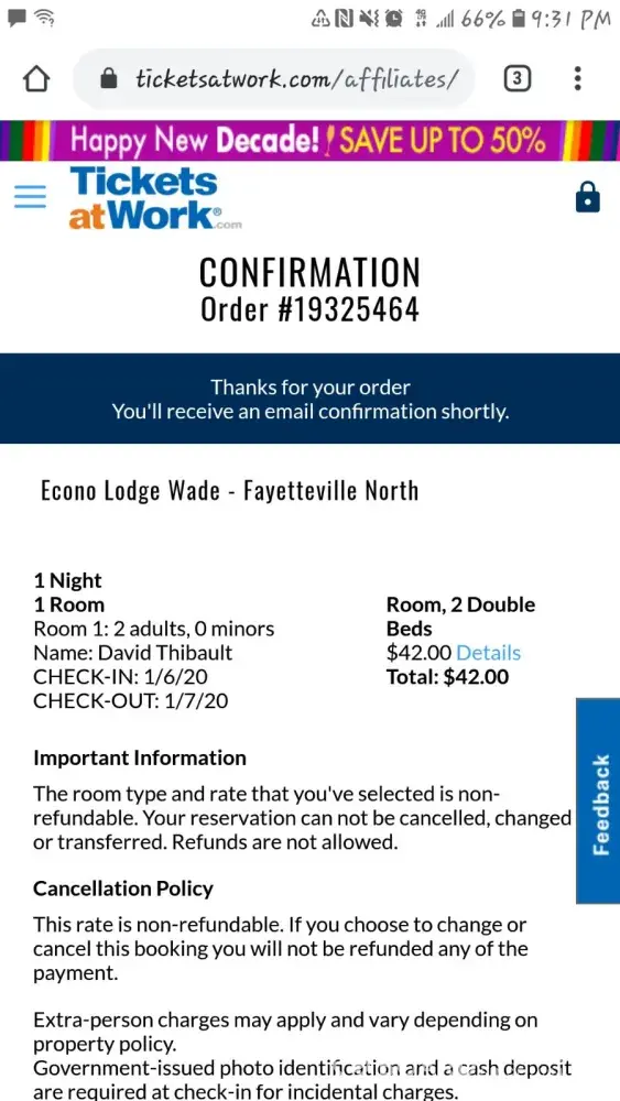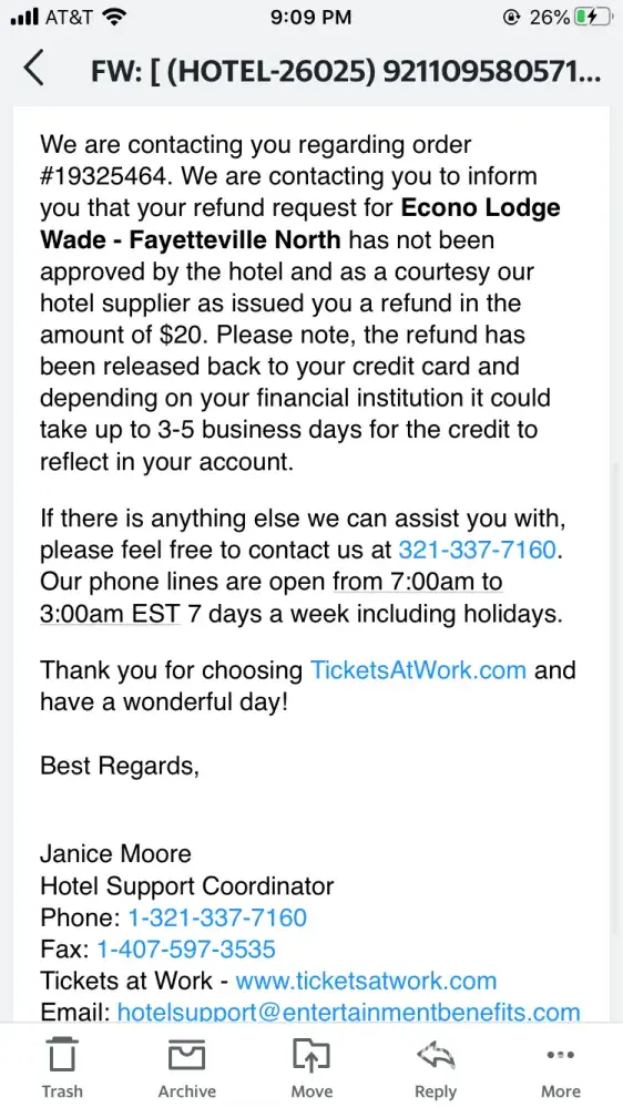 My wife and I went on a road trip at the beginning of the year. We used Tickets at work to book the hotel/motels we stayed in. On the 6th of January, we needed a motel to stay in Fayetteville, North Carolina. On the website of Tickets at Work was offered a room in Econo Lodge Wade - Fayetteville North on 3945 Goldsboro Rd, Wade, NC 28395. There were pictures of the room and a full description of the motel. The price was good for us, and we have stayed many times in Econo Lodge so we were ok with the offer. We booked our room and drove to the motel. Upon arrival, we noticed that there are no signs or the logo of Econo Lodge on the address that we were provided when we booked our motel room. When we checked on google we realized that Econo Lodge was permanently closed. The building that probably Econo Lodge once existed was not renamed and owned by OYO hotel or DaysIn, I can't say with certainty since there were two different signs on the building. We reserved Econo Lodge because we trust the company, we have stayed before and we are satisfied with what they offer. We did not fill safe to go to the building that was unclear about what hotel or motel is exactly. I called Tickets at Work and explained my situation. The customer service kept putting me on hold for a couple of minutes and in one part of the conversation laughing at me while I was trying to explain what has happened to us. I was told that that is the motel I have agreed to book and they as a third party cannot do anything about it, cannot cancel it nor refund me. I tried to explain many times that the motel I booked and the motel that is on the address is not the same but it was without any success. Finally, I decided to go to the motel and try my luck there. They had my reservation but I explained to the receptionist that I have booked Econo Lodge and want to cancel. After almost one hour of trying to cancel the receptionist said that the room will be canceled and we will be refunded. The next day my bank account was charged for the room at a motel that I do not even know the name of, never stayed there and was told it was canceled. I called the number I was given by the motel on the address I provided above, and even though they had my information the night before, now they did not have any information about me. I called Tickets at work and filed complain but was not able to get my full refund of 51$ but only a 20$ refund from Tickets at Work. The problem was not the amount but the fact that we have led to book a room in a motel that does not exist anymore did not receive any support from the website that provided inaccurate information (tickets at work) and were not treated with respect from their customer service.
