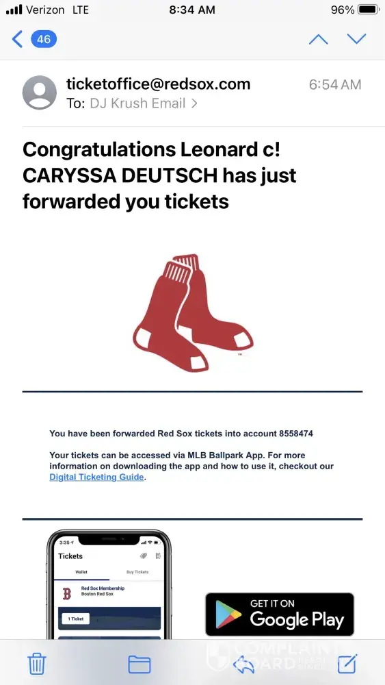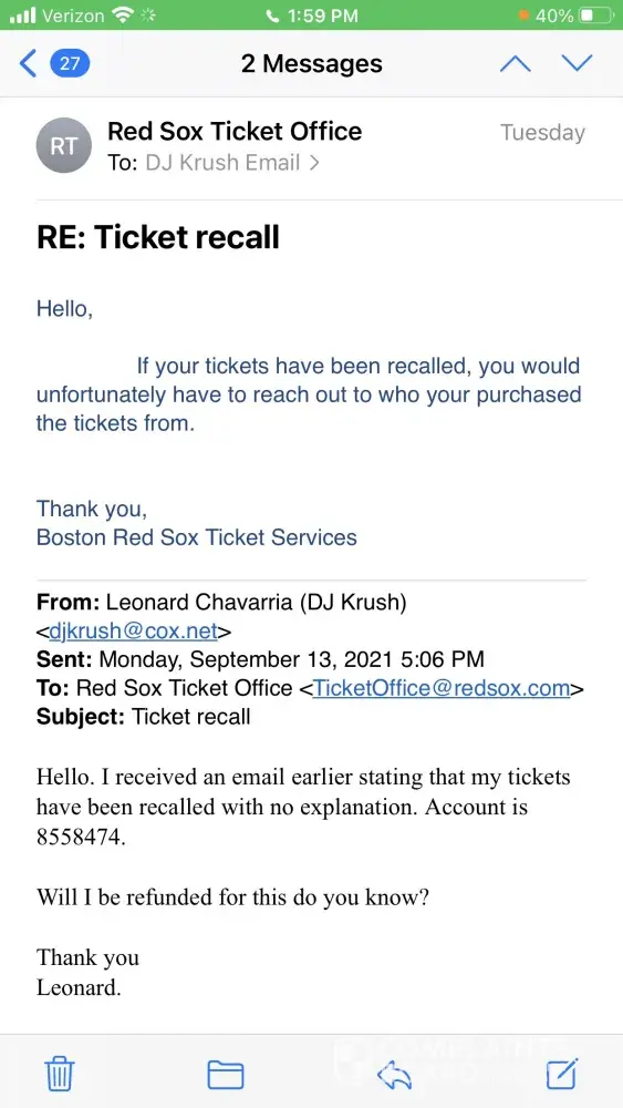 Bought Tickets thru Tickets @ Work for Red Sox vs. Orioles game on 9/17/21. I did receive the tickets and initially I was good. I was referred to download the tickets via "Ballpark" app. Then on 09/13/21 I received an email from Boston Red Sox tickets had been recalled. Gave no reason or who recalled them. I checked the app and yes those tickets were no longer visible or in my possession. Come game day I had no tickets. Tried to plead my case and was denied as all sales are final. I need help as to why they were recalled or by whom. As of now I've been ripped off $380. I just have no idea if I've bought something how can they be taken back with no reason or refund? Thank you