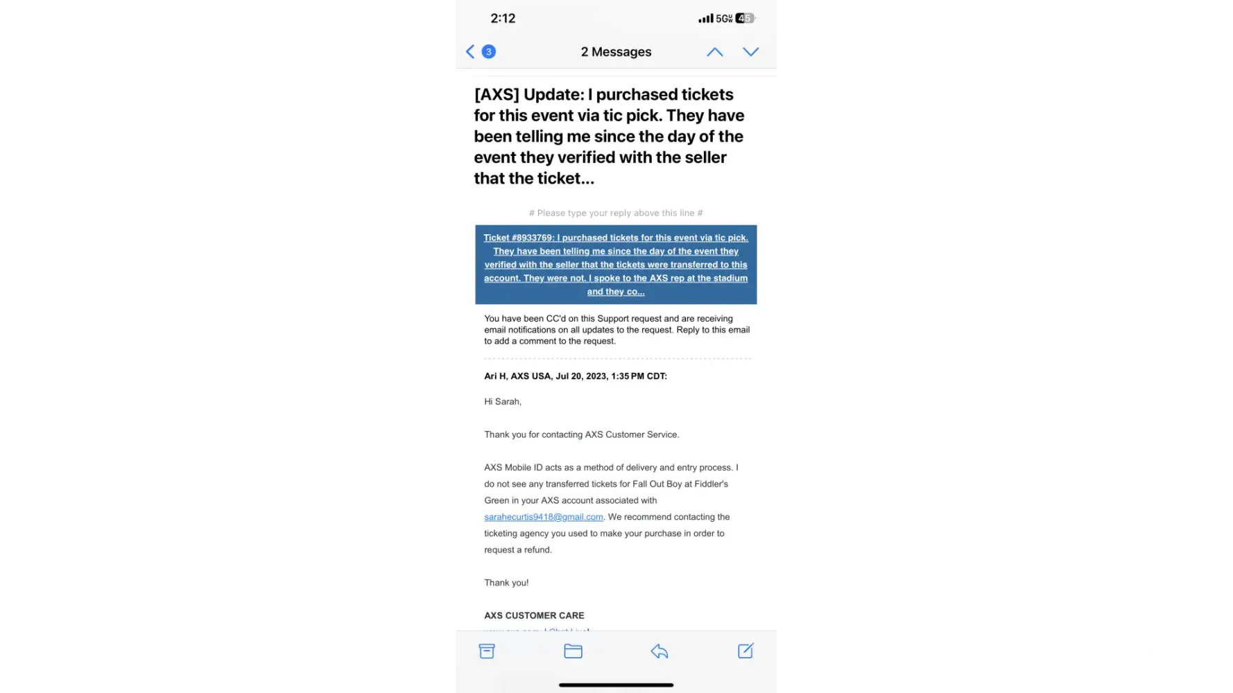 Bought tickets on July 9th and never received tickets. They said the investigated and the proof the seller provided was a screenshot that was clearly altered. AXS confirmed tickets were never transferred to me. I was forced to buy tickets at the door as well.