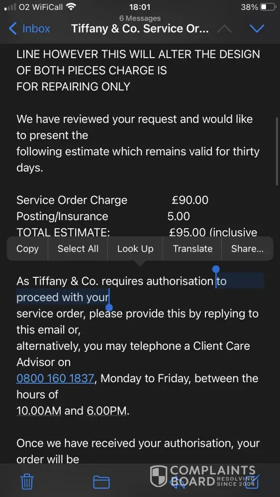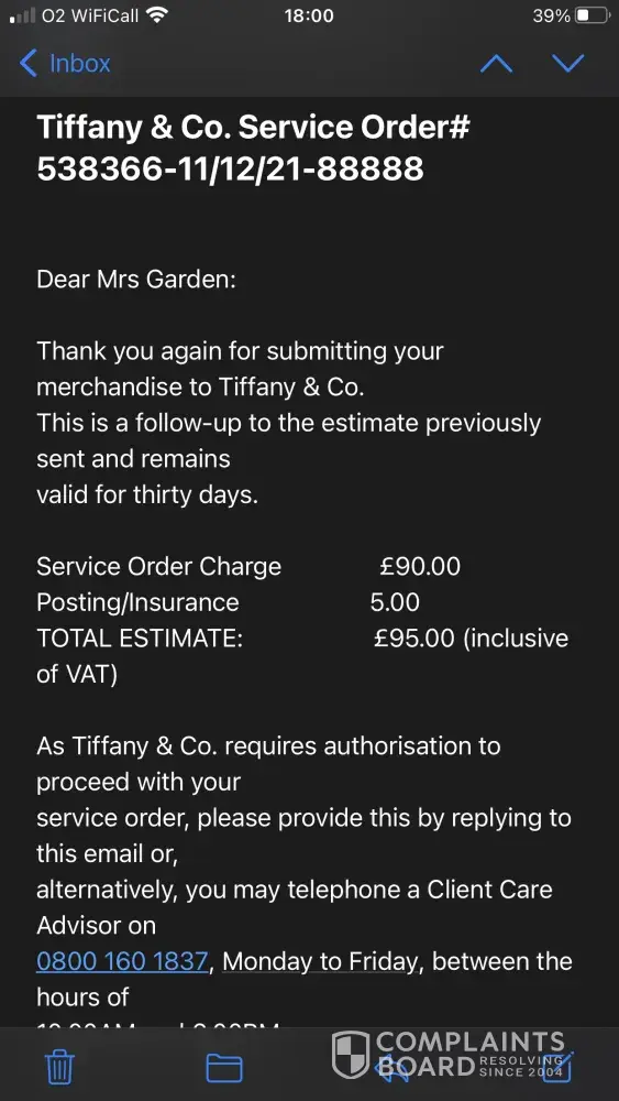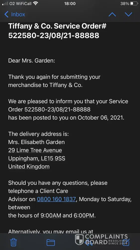 - While Tiffany & Co. has a high level of trust, our investigation has revealed that the company's complaint resolution process is inadequate and ineffective. As a result, only 17% of 40 complaints are resolved. The support team may have poor customer service skills, lack of training, or not be well-equipped to handle customer complaints.
