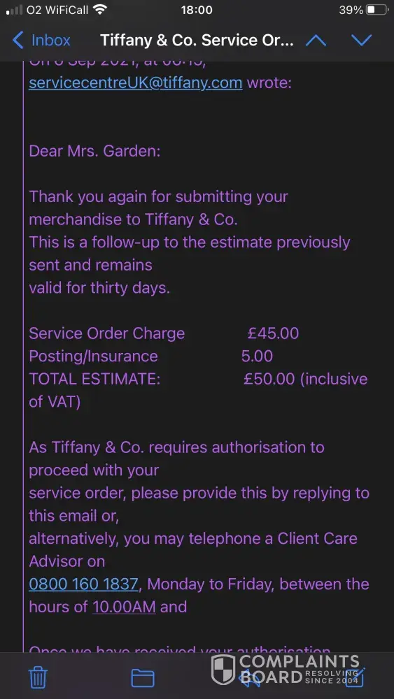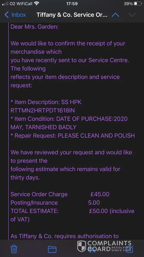 I have contacted Citerzans advice who have informed me that as I did not receive any paperwork with my purchase then it is down to Tiffany and Co to incur the cost of a courier to return the item for inspection/ repair and not down to me as the consumer.