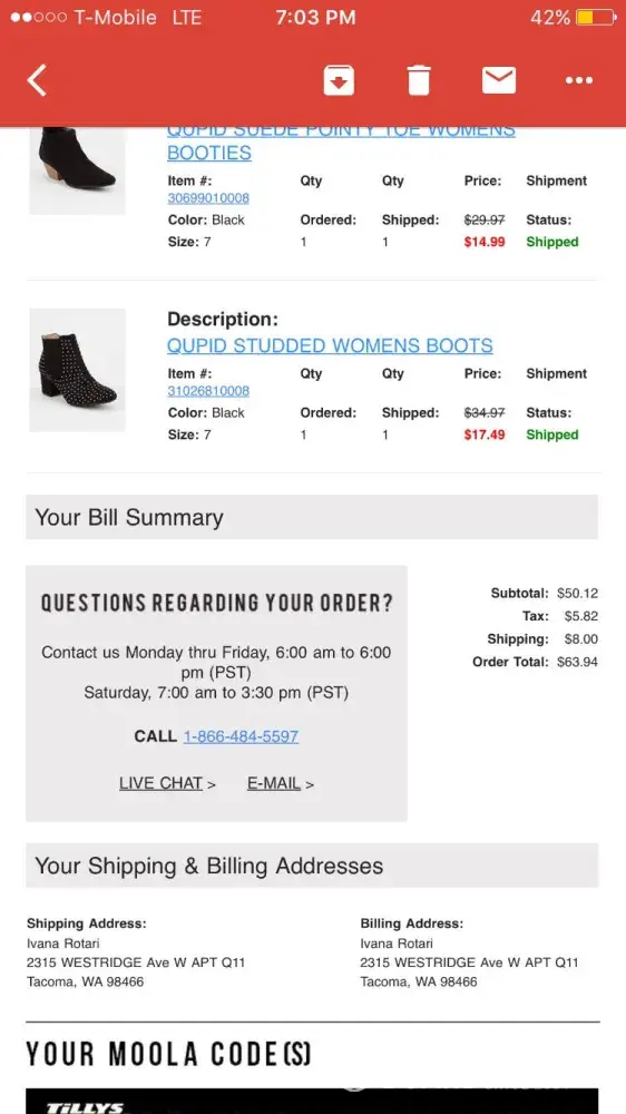 I ordered a few items I purchased online because if there were problems, the items could be returned to the Tacoma mall Steele St location . I purchased two pairs of shoes, a few necklaces, and a dress, I love Tilly's but a pair of boots that I ordered did not work at all. I tried wearing them to work and the zippers woudn't stay zipped so it was giving me problems at work. I went into the store to return the item and the cashier told me because I wore them, they couldn't be refunded. She offered the mangers explanation but he said the same thing. I was very upset and tried to defend myself by saying that I didn't even get to wear them a full day at work. I'm a hairdresser and there was just a little hair on it. It still had the stickers on underneath the shoes, and I had to change into my gym shoes in the middle of work because the zipper kept rubbing down my heels and it made it very uneasy to walk. I left without the boots because I was furious.
