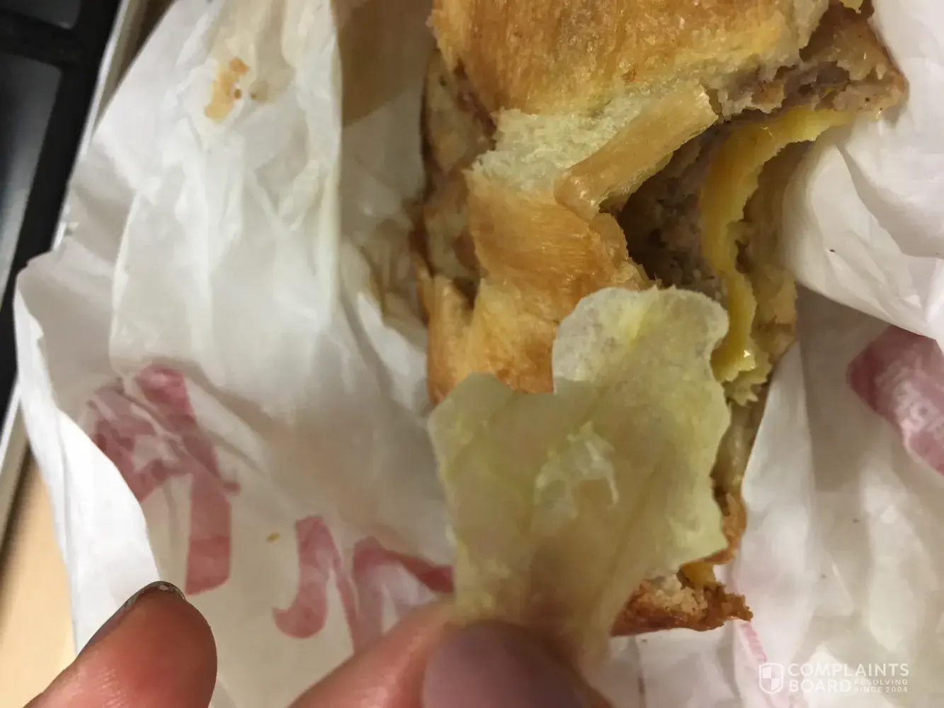 August 27th we stop at a Tim Horton around 9 o'clock in Sept-Iles Quebec. I ordered a sandwich with chipotle no 4. There was 2 pieces of meat: a smal and thin piece of meat and a largert one, dark brown but very stiff, so stilf that I could not chew it. I try to break it with my fingers but could not make it. I showed it to the server, she grab it and then I no proof of bad quality of this product.