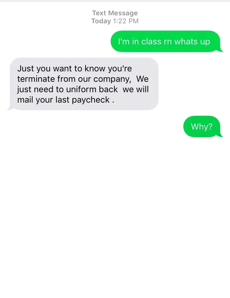 I worked at Tim Hortons for a year. I was fired without an explanation. I went back to return my uniform and get my termination papers and the district manager started yelling at me saying "get out of the property or I'll call the cops" without even reason to treat me like that. He refused to talk to me or give me my termination papers which I needed to be able to at least get unemployment until I could find another job.