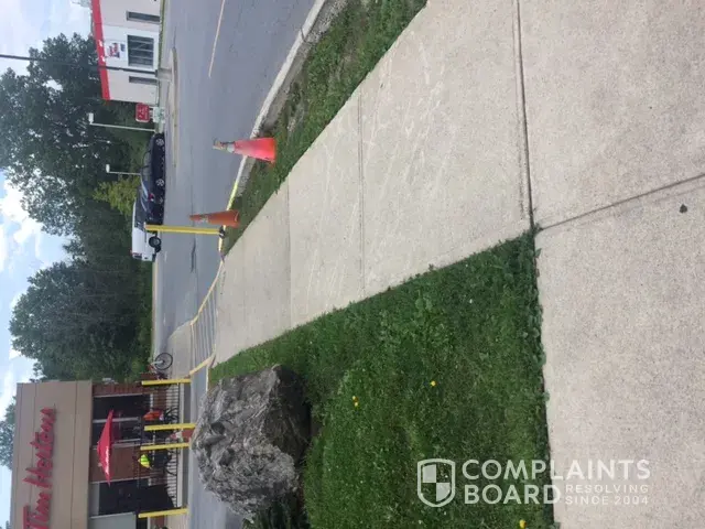 To be clear I was driving my personal pickup truck (which is in itself a tight maneuver due to the limited width of the drive through lanes) I heard a scraping sound while negotiating a curve. I of course, was initially embarrassed and did nothing hoping no one noticed. However upon stopping to inspect the nature of the scraping sound, noted some minor damage to the lower half of my passenger door (picture attached) I returned to the drive through and noted a rock was in the landscaping bordering the drive through and was in fact protruding into the lane. Initially I spoke to the staff but they said there was nothing they could do so I left. A few days later upon my return [protected]), I saw that the same rock had been removed and there was pylon’s and tape in position to assist drivers navigate this same corner. I was left thinking that had these same precautions been in place just 2 days earlier I would not have experienced this damage.