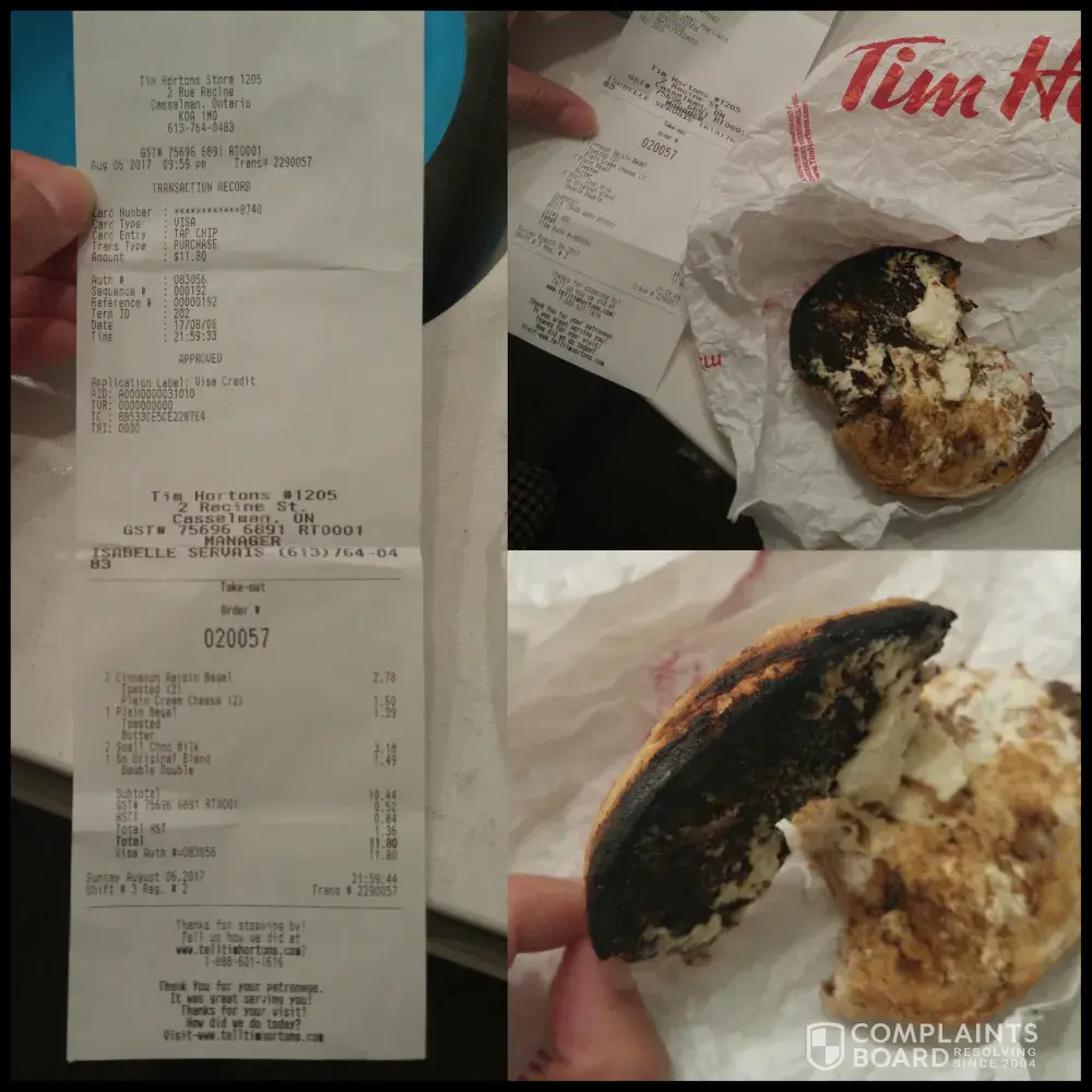 I felt very upset and angry about the service, I live Tim Horton's, and I trust the quality, but those Burnt Bagles are make me n my family really upset and mad.