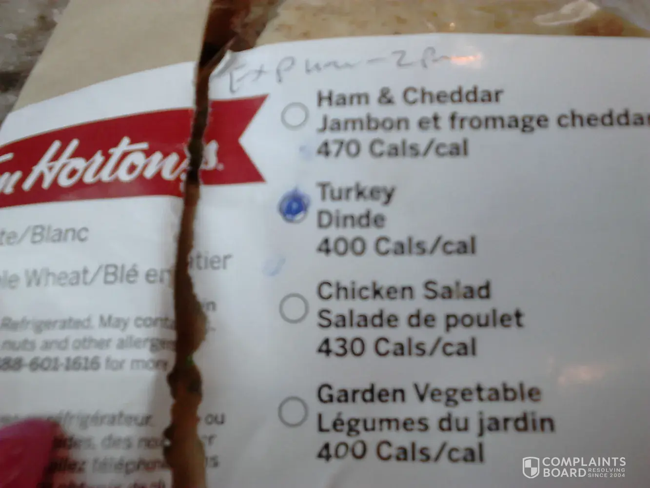 Disappointed, I took my order and found a seat. I opened my sandwich and took a bite... the sandwich was soggy, the lettuce was wilted, and it did not at all taste like a Tim Horton's sandwich. I started examining the packaging and realized that I was sold this sandwich 2 minutes before its expiry time, and by the time I started eating it, the sandwich was considered to be expired.