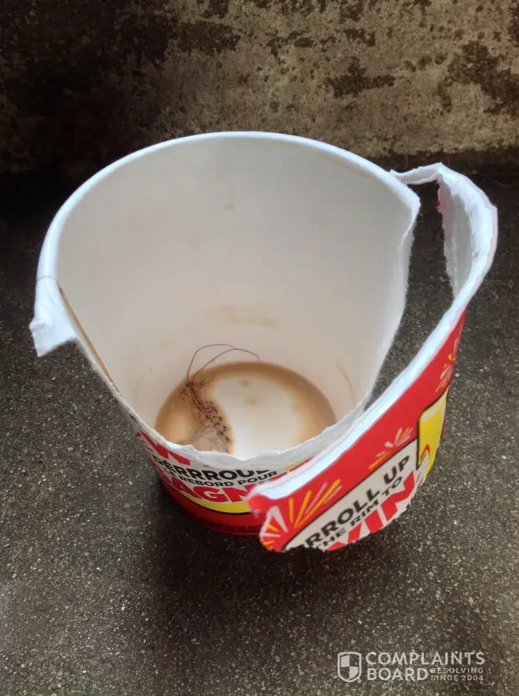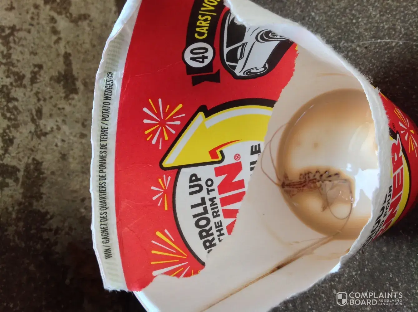 I recently took a take out coffee only to find an insect in the bottom of my cup. The cup was a winner (Roll up the rim) for free potatoe wedges, but I was absolutely sickened to find the creepy crawler at the bottom of my cup. I do have several photographs of the cup and culprit. I'm trying to let it go... But now i'm hesitant to visit that location in burlington ontario, as I fear it is hygienically unsafe. I am not the person to cause a fuss, but I fear that this has really put me off.