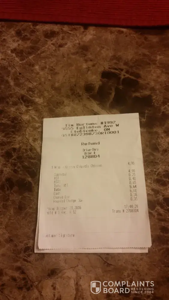 I thought they will give me something like a new wrap or the ingredients on the side. Instead of that the Manager said "you have finished most of the wrap...we can't help it. Here is the refund" by giving me some $5 and change...and said "Never come back to this Tim Horton's we don't need your business".