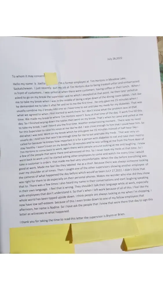 I'm a former employee of Tom Hortons. And I have been yelled at I've been bullied, embarrased by one of my supervisors. This happened on July 28, 2021. On 2 occasions that day , the supervisor that was on duty. I asked to go on my break. He said no. Do I said ok. He then changed his mind and said go on your break but not in kind words. I was finishing up the tables, when he came back to the dining room and yelled. Go on your break. That I have 15 minutes. I usually have half hour because of my meds and eat. But he never let me.In front of customers.