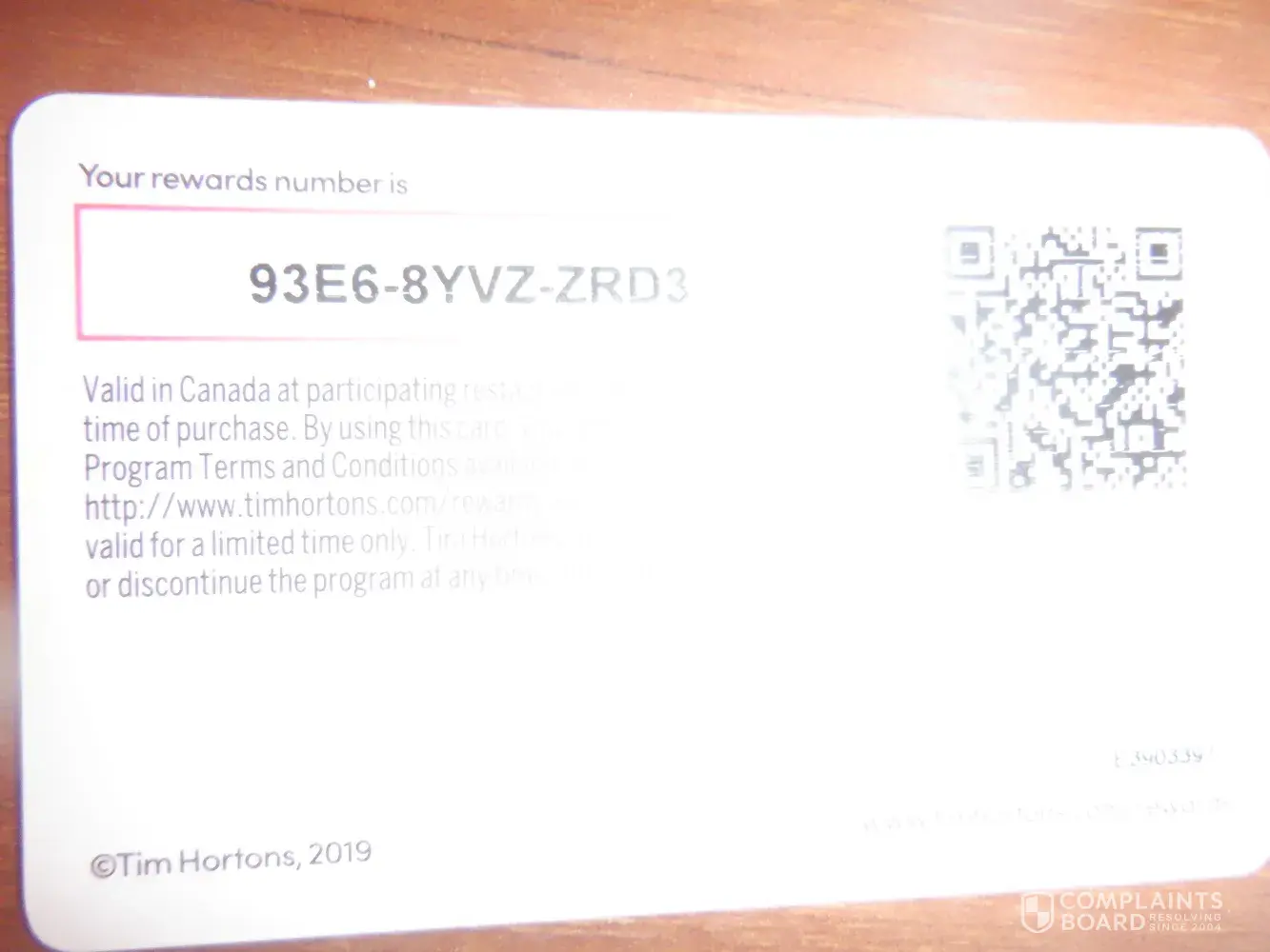 Tim Hortons Reward card