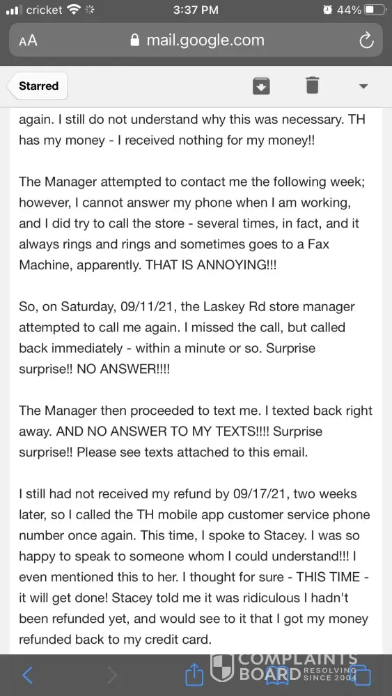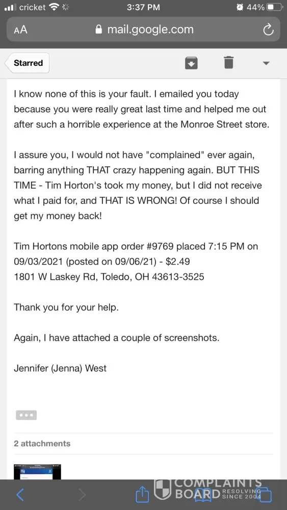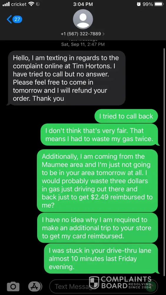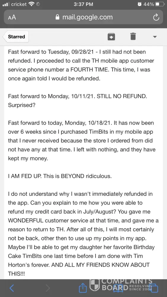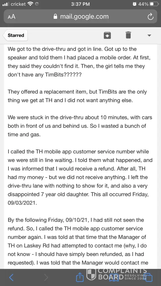 I purchased TimBits in the app for me and my daughter one Friday afternoon. Got to the drive-thru and was told they didn't have any timbits to fulfill my order. We don't like anything else there except Birthday cake and chocolate timbits. They had neither. I left - they kept my money (I had already paid in the app). Got managers name (Francis). I called the Tim Hortons customer service line from the app a grand total of five times, beginning that night and once each week for the next five weeks. I also attempted to contact the store directly and speak to the manager but it he phone is never answered. I also emailed TH customer service (I still had a saved email from a prior bad experience at a different store - which was resolved immediately, by the way!) I have never been refunded my money. I paid for a product, wasted my time and my gas in the drive-through line, was not given what I paid for, and I have never been reimbursed. The store manager did text me and say I could come in to get my card refunded. I don't think that should be necessary considering I would have to waste more time and gas just to drive to the store to get $2.49 back. The app - or the store - should have refunded my card by now. Absolutely ridiculous. Tim Hortons basically stole my money by never refunding my card.