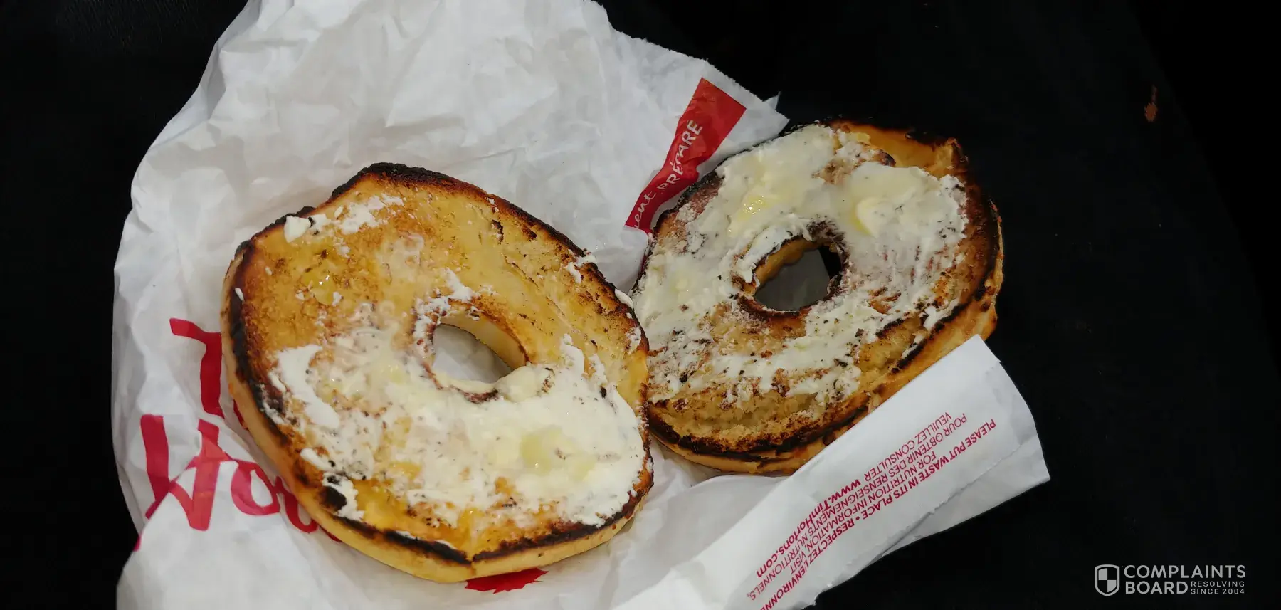 I worked for Tim Hortons for almost 5 years on sandwich bar. I have a picture to show you, I got a four cheese bagel with butter and cream cheese. I know how the food should be made, I made it everyday, I know what the customers expect, I am a chef now. When I opened my bagel, I was not happy one bit, it had barley any cream cheese at all. It was honestly...