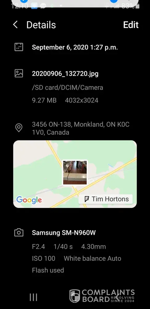 I have attached a print screen of the picture with the date, time, and location details for your convenience. I also the pic (too large to attach) as seen in the print screen, and can provide for convenience of corroboration and verification.