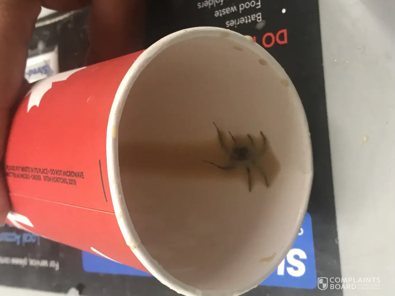 Upon getting too work I went in the office and continued drinking my coffee . Never leaving it out of my site in front of co-workers. At the end of the drink I felt a tickle on my tounge. I stopped drinking the last 1/3rd of the coffee. Opened the lid. And seen something floating in my cup.