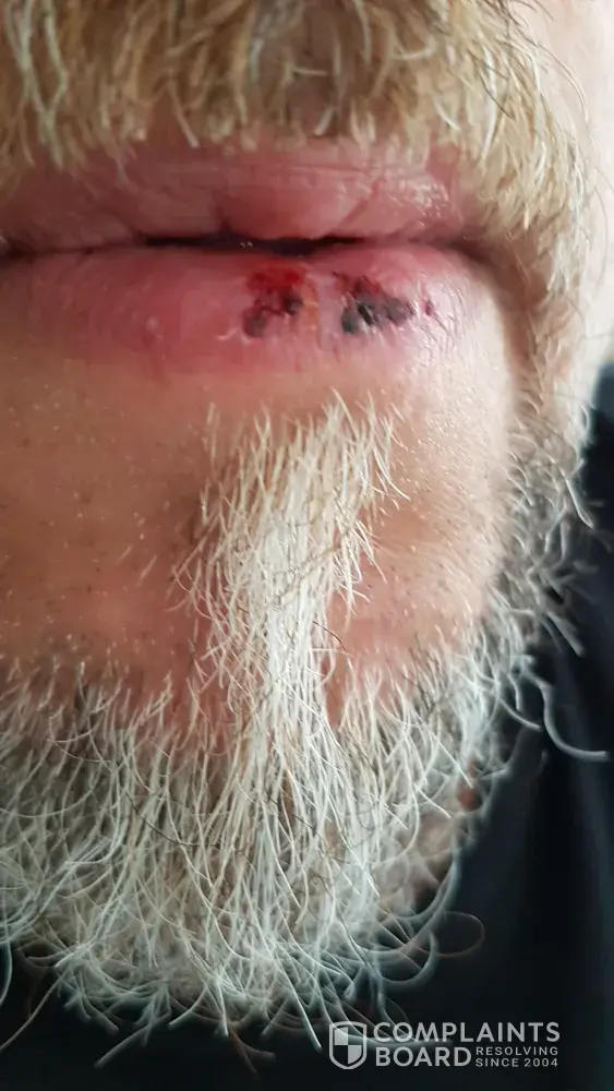 Tea water burnt, blistered, scabbed my lip.