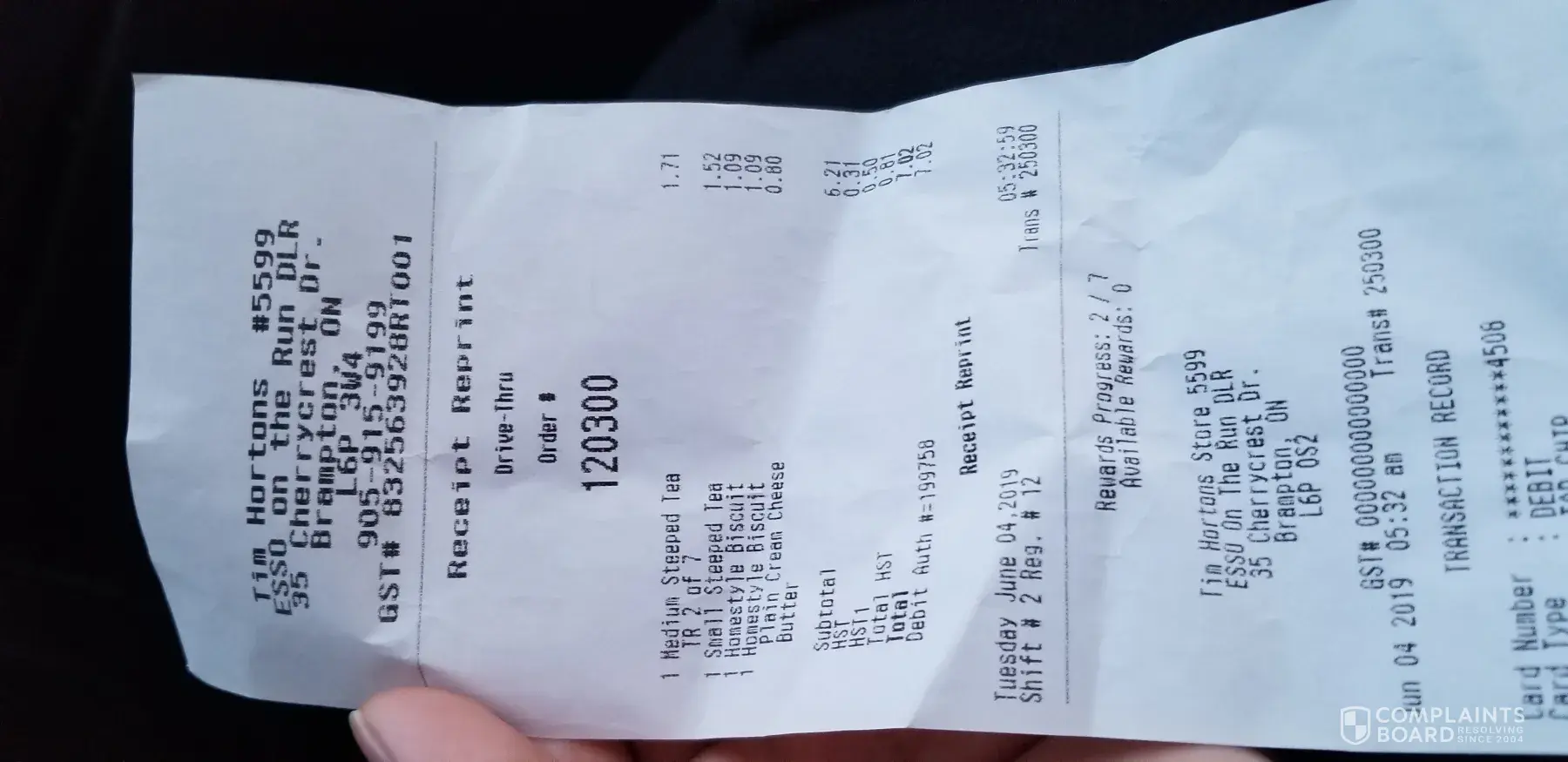 Good afternoon.. I am a regular Tim Hortons client. I use your wonderful rewards program and enjoy the free coffee after a purchase of 7. His morning at 6:24 am I went to the London Line Tim Hortons in Sarnia, Ontario and I thought for sure I'd get a free coffee as I know that I go daily to Tim Hortons. I bought an XL three cream and a medium double double. I handed in my rewards card and paid $4.05. I later went back around 10:45 am for another coffee, still no reward. I drove off and decided to check my rewards history online when I returned home.