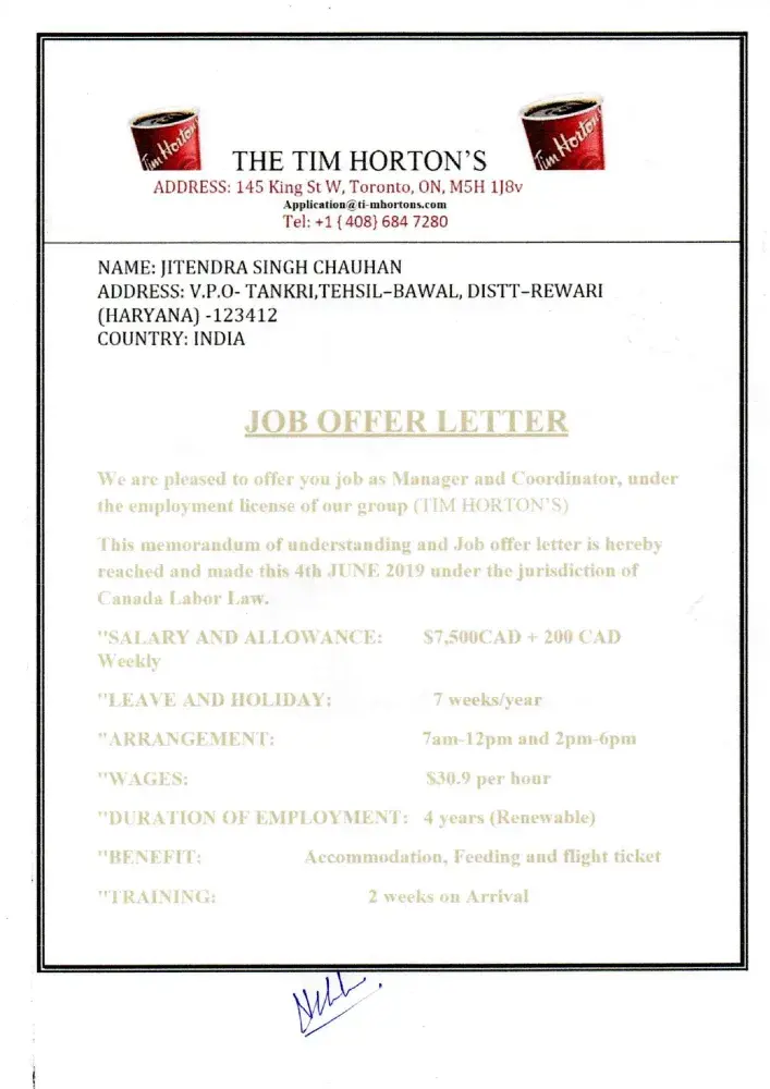 I have received job offer letter from Tim hortons group canada, pls check and confirm whether it is fake or real/