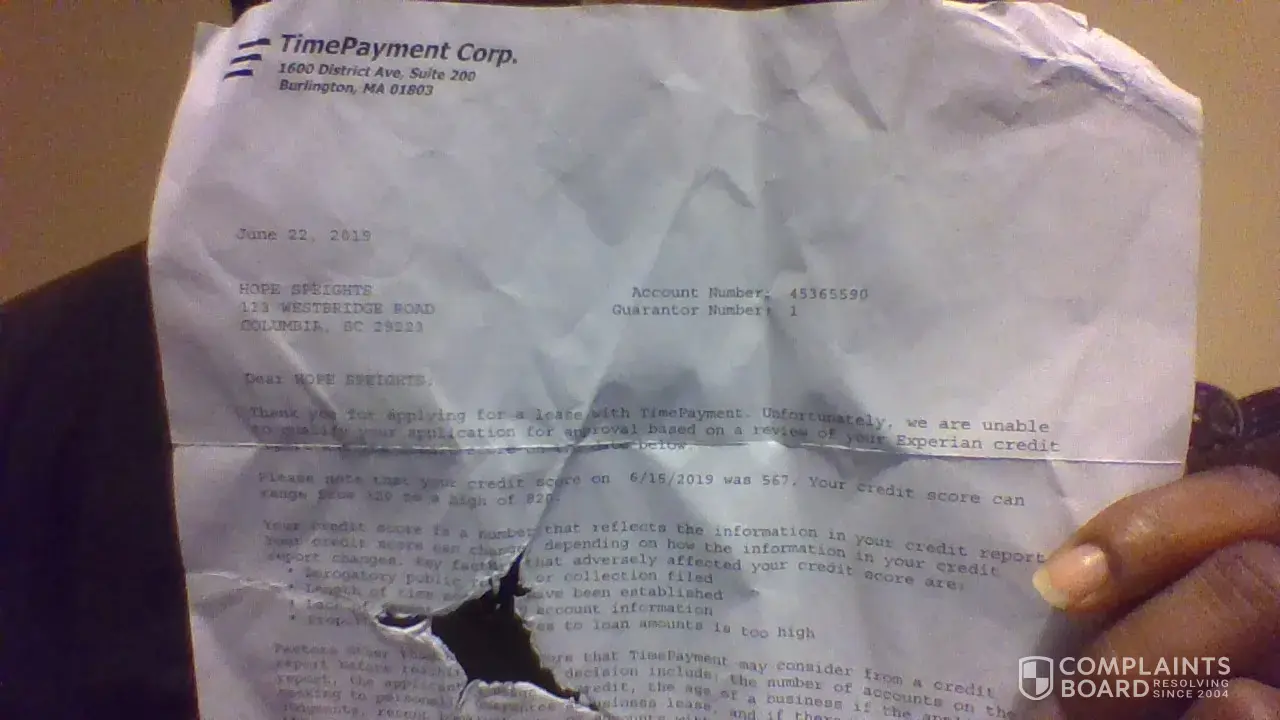 I was outside one day and a young lady walked up with two other guys and approached me about a security system which was suppose to be from ADT. When they stood in my yard we discussed about an alarm system that I can get approved for would be a bundle package for a security system. We talked for a minute in a big group then they had some papers and asked for my information. Supposedly as we waited for the approval I was denied for ADT they claim. Then they said they it was another company for me to get approved for and the company which was no name was given was suppose to approve people that had the worst credit score. Then we continued to wait and wait, then I was told that I had needed a phone first to get the security system. So the young lady told me that she will give me a call at a number that I gave her to contact me and I never heard from them. Checked my mailbox and received a letter from time payment corp saying I was denied for my credit being a 567. I was scammed and are very curious about this because they have my personal information and I have no way to contact them to tell them about their selves. My email address is [protected]@gmail.com. My name is Hope Speights and I received this letter after June 22, 2019. Please contact me at [protected] or by email Thanks. Please excuse my paper for the damage. I have three kids that got hold of it. Again thanks.