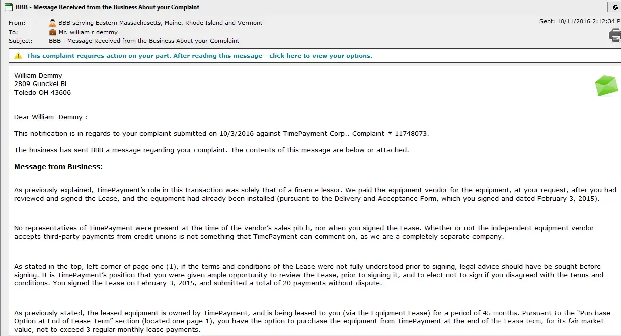 - While TimePayment has a high level of trust, our investigation has revealed that the company's complaint resolution process is inadequate and ineffective. As a result, only 5% of 17 complaints are resolved. The support team may have poor customer service skills, lack of training, or not be well-equipped to handle customer complaints.