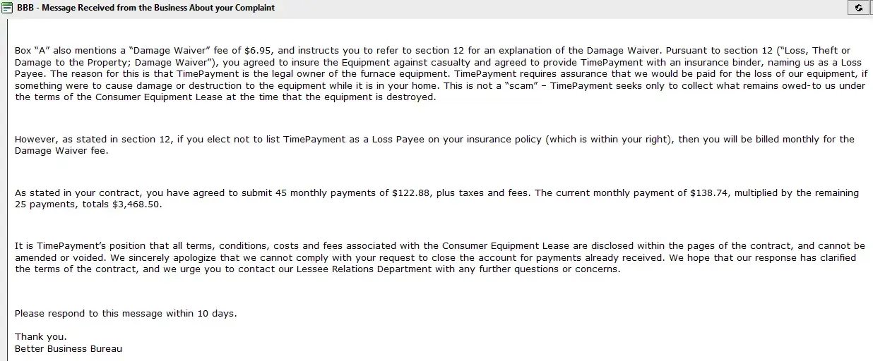Now Time wants an additional $2800.00 plus a two payment fee to buy our furnace after we pay the lease fee.