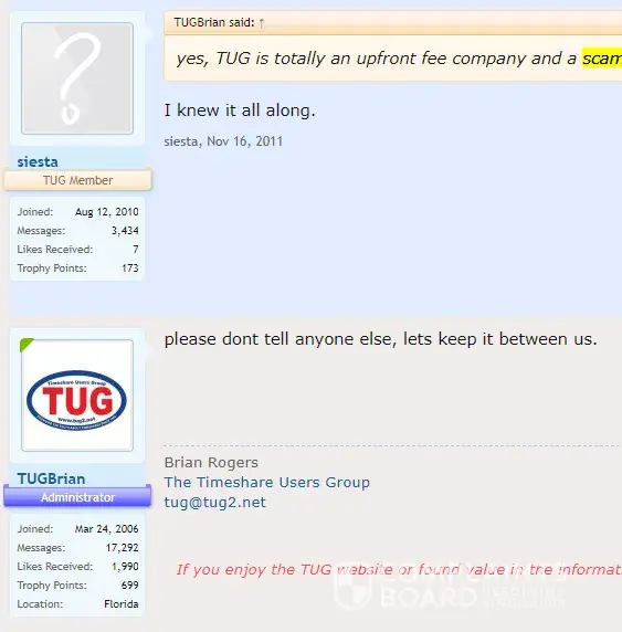 Bottom line...TUG - Timeshare Users Group is a WORTHLESS ENTITY, run by a HYPOCRITE. I should also mention that this creep advised me that he is friends with the administrators of various complaint websites, and that he would have my posted complaints removed. I challenge him to do so, in the interest of freedom of speech.