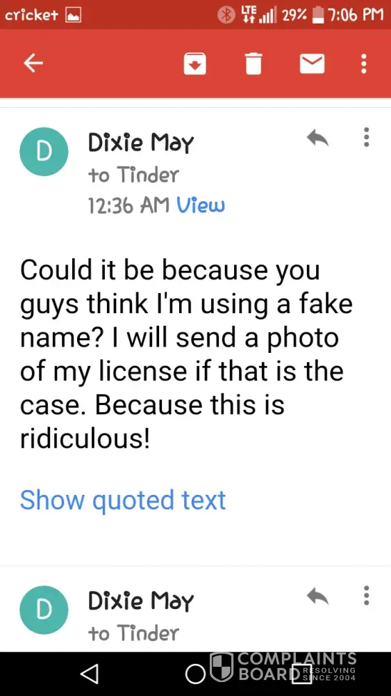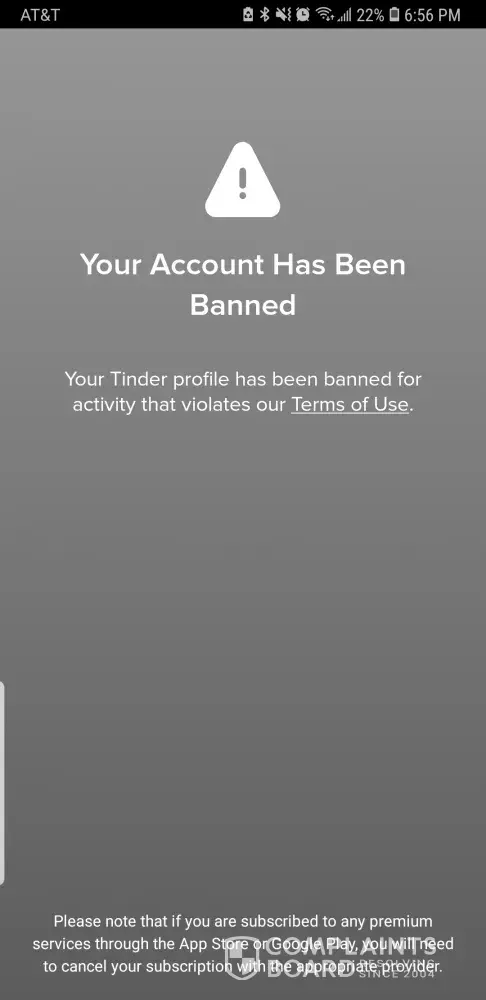 I've been a tinder user on and off for years. In that time my account has been deleted without notice multiple times, and now I'm banned for no reason. I went through all the terms of service, and I've never violated any guidelines. However, I have noticed a trend. This only happens when I reject a guy or the conversation isn't going smoothly. This time around I was speaking to a guy who has BDSM pictures up all over his account and in the description "looking for someone to play with". I was asking him basic questions that anyone in that scene knows to ask. (you don't just jump into bddm with someone lightly) if anyone wants further info on this subject YouTube Evie Lupine and Britney Simon as they're great educators. But I quickly noticed he was a predator that targets people who are new to the scene and the next thing I knew my [censored]ing account was banned. This is just one example of how [censored]ed up and sexist tinder is. It seems they delete and ban my account if a guy doesn't like what he hears and this needs to get a lot more attention than it is getting. This company should be shut down without notice or reason just like they do to its users.