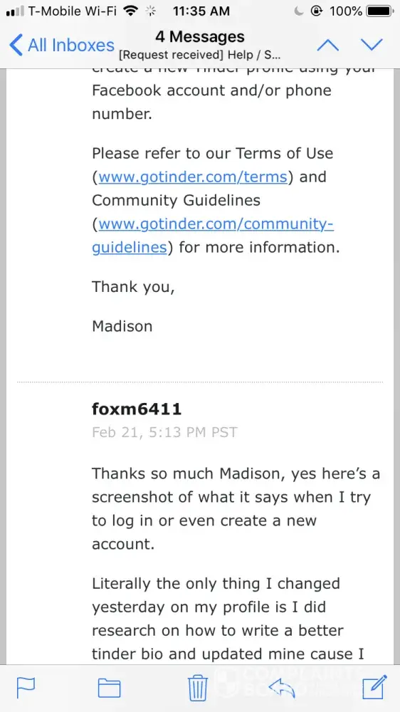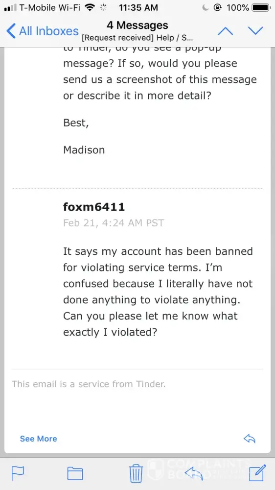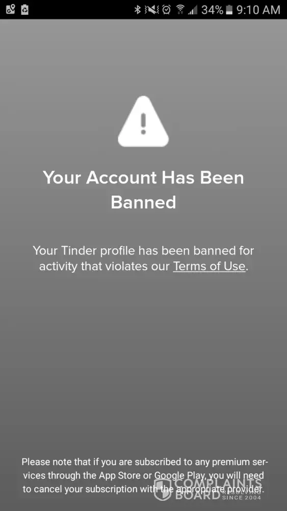 Hi there! My account on tinder was banned for no reason whatsoever. I had my account set up for less than a couple of hours. I had swiped away; did not match with anyone so I didn't even have a single conversation. The next day I went to the app and I couldn't log-on/received an error message; I sent them an e-mail asking why I couldn't log-on and they replied saying I had violated the "terms of use or the community guidelines in some way". I emailed them asking to advise what rule(s) I had violated, they simply said "they take violations seriously …. Unfortunately cannot provide any more detailed information" and I was to re-read all the terms of use (which I did). And they said they "do not offer appeals". I actually took the time and have read through the terms of service and community guidelines and for the life of me cannot find any violation I may have allegedly committed (?). All I want to understand is why the ban, and allegedly which rule(s) I broke. I also did a search online about tinder bans, and found so many complaints about no reason for banning users. I will not use the tinder app ever again (and apparently they will never let me), but I would like for them to provide evidence of my guilt and I would like my name/account cleared. Innocent until proven guilty. I also wonder if users who were banned for no reason can "ban together for a reason" again them …